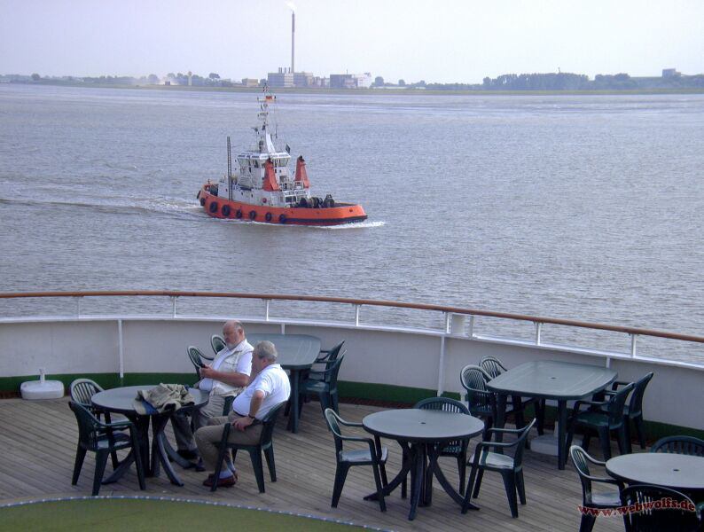 Am Abend wird die TS Albatros vom Schleppern aus dem Hafen gezogen.